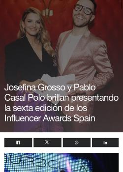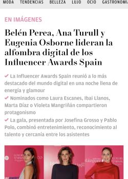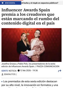 Prensa SLOCUM MAGAZINE 19/02/2026 Los Influencer Awards Spain se consolidan reconociendo el talento. Ver más 20minutos 17/02/2026 Influencer Awards Spain premia a los creadores que están marcando el rumbo del contenido digital en el país. Ver más INFO⎮LUJO 13/02/2026 Josefina Grosso y Pablo Casal Polo brillan presentando la sexta edición de los Influencer Awards Spain Ver más EL CORREO DE BURGOS 13/02/2026 El mejor influencer ‘Gastro’ estudia en la UBU. Ver más DIARIO DE NAVARRA 12/02/2026 La joven residente en Egüés, Elvia Gómez Troya, de 13 años, ganadora más joven en la historia de los Influencer Awards Spain. Ver más LOOK / Ok diario 11/02/2026 Belén Perea, Ana Turull y Eugenia Osborne lideran la alfombra digital de los Influencer Awards Spain Ver más SLOCUM MAGAZINE 06/02/2026 Entrevista a Elena Gonzalez Carbonell, CEO y fundadora de Influencer Awards Spain. Vee más 20minutos 31/01/2026 Alfred López finalista en la categoría de Cultura y Educación de los Influencer Awards Spain 2025. Ver más DIARIO DE AVILA 11/01/2026 El 'profe' de particulares más influencer. Ver más EXCELENCIAS Gourmet 08/01/2026 Influencer Awards Spain desvela los finalistas de la categoría Gastro Ver más FARO DE VIGO 30/05/2025 Erea Louro Influencer y escritora: «He tenido varias crisis; ¿realmente me representa mi Instagram?» Ver más El Diario Montañés 28/02/2025 La cántabra Rocío Barrio gana el premio a la Mejor Influencer de Belleza del año Ver Más Páginas1 2 3 4 5 siguiente › última »
